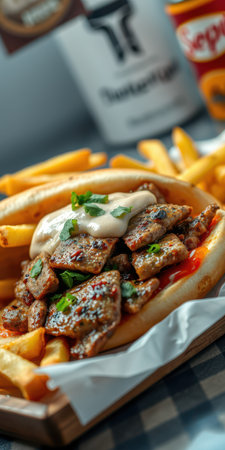 Delicious beef wrap filled with fries, vegetables, and sauce on a wooden board served in a casual dining setting