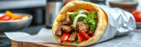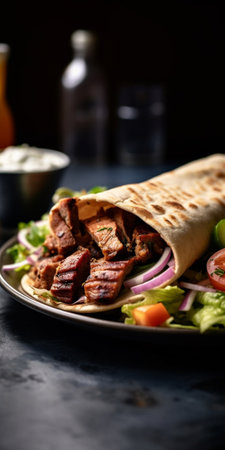 Savory grilled meat wrap served in a casual dining setting with fresh ingredients and condiments