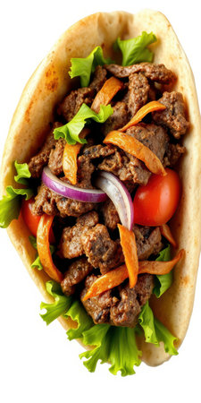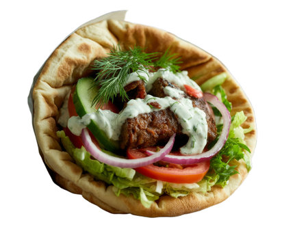 A mouthwatering close-up of a Greek gyro overflowing with succulent lamb and beef, creamy tzatziki sauce, crisp lettuce, juicy tomatoes, and fresh onions. This appetizing overhead shot, on a white background, is perfect for menus, websites, and food blogs. The transparent PNG file ensures seamless integration into various design projects.