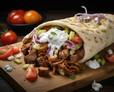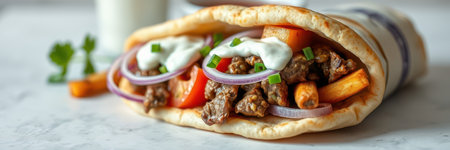Fresh Greek Gyro Wrap with Meat, Tzatziki, Tomatoes and Onions