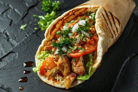 This image features a tantalizing grilled meat wrap filled with fresh vegetables and herbs, served in soft flatbread. Perfect for food lovers!