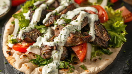 Grilled gyros meat with crunchy pita veggies and garlic sauce