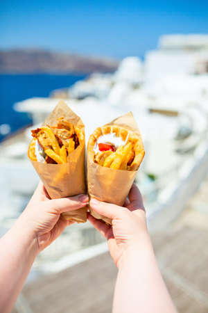 Greek gyros wrapped in pita bread photographed against traditional greek town with white houses