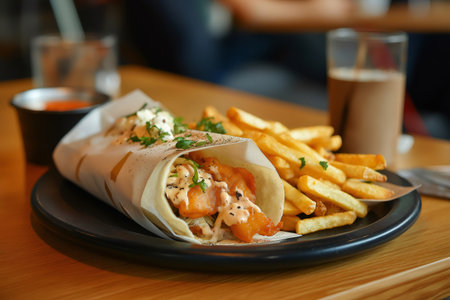 Delicious fish and chips wrap served with French fries on a black plate, accompanied by aioli and ketchup, ready to be enjoyed