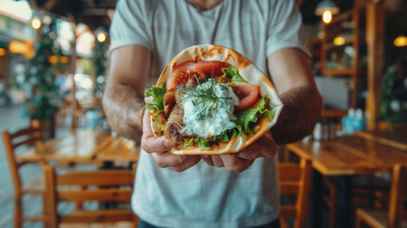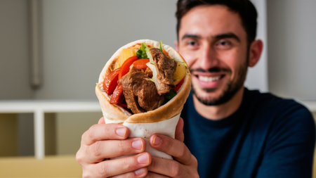 A man holding a Greek gyros wrap with meat and vegetables inside, AI