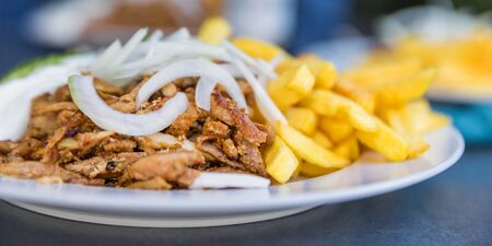 Doner kebab - grilled meat with french fries and vegetables
