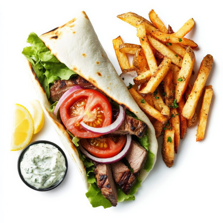 A Greek gyro wrap with grilled lamb, sliced tomatoes, red onion, lettuce, and tzatziki sauce in a warm pita. Served with lemon wedges and crispy seasoned fries. A Mediterranean street food favorite. Isolated on clean white background