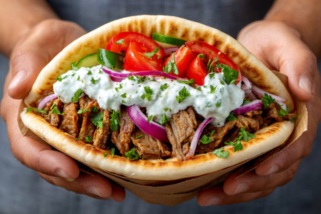 Delicious homemade pita stuffed with juicy meat, vegetables, and creamy toppings ready to enjoy