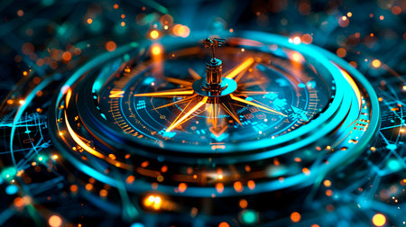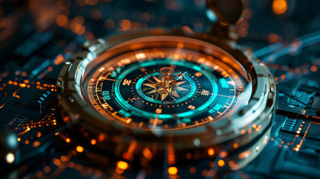 This image showcases a digitally rendered compass with bright orange and blue glowing elements. The circular composition, featuring intricate details, is set against a dark background creating a high-tech or futuristic look. The illustration's design may be suitable for a variety of commercial and editorial purposes.