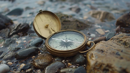 A hand holds an open antique compass, showcasing its intricate internal mechanism. The aged brass instrument is positioned near a body of water with rocks. Soft, natural lighting bathes the scene. This image could be used for illustrations related to travel, exploration, or navigational concepts.