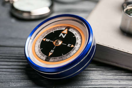 Vintage compass on dark wooden background, closeup