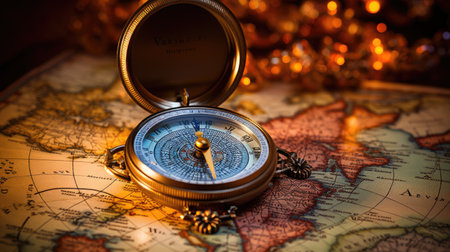 Ornate brass compass lies atop an old, weathered map, symbolizing exploration and adventure