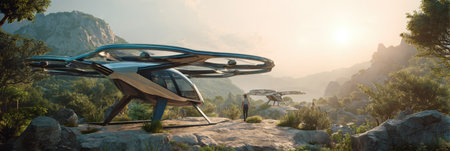 Futuristic flying vehicles rest among lush greenery and rocky terrain at sunrise, creating a scene of advanced technology and natures beauty.