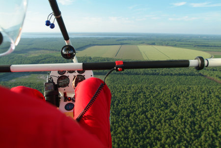 Yalutorovsk, Russia - May 24. 2008: The motorized hang glider above forest at sport airdrome