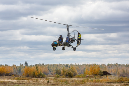 Balashikha Russia Black Airfield 22 May 2021: gyroplane Gyro Classic demonstration flight the Sky aviation festival, theory and practice.