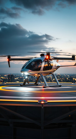 An autonomous electric vertical takeoff and landing aircraft on a city vertiport. This futuristic air taxi represents the future of urban mobility and transportation at dusk.