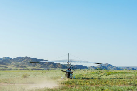 hang glider takeoff in the Kazakh steppe. light aircraft with a pilot and passenger