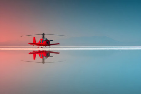 Helicopter on Tranquil Water Surface with Stunning Reflection at Sunrise Generative AI