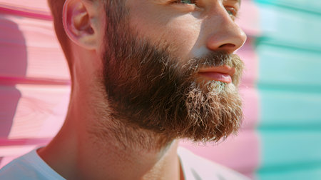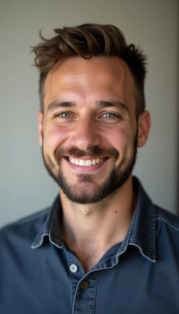A cheerful young cute man 30 years old, resident of USA, with short hair and a well-kept beard smiles warmly while wearing a casual wear. Soft lighting enhances the friendly atmosphere. Generative AI.