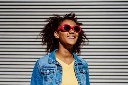 Close up side portrait of beautiful young african american woman smiling and looking up