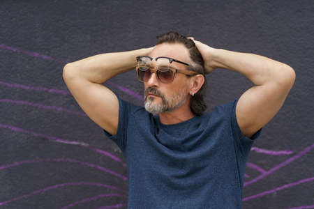 Young hipster with a beanie and glasses posing in front of colorful street art