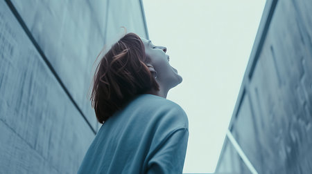 A contemplative young woman gazes slightly upward neon yellow wires framing her delicate face. The soft light creates an ethereal quality highlighting her thoughtful expression and.