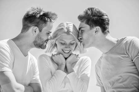 Friend zone concept. Happy together. Cheerful friends. People outdoors. Happy woman and two men. Friendship love. Friendship relations. Member friendship wishes to enter into romantic relationship