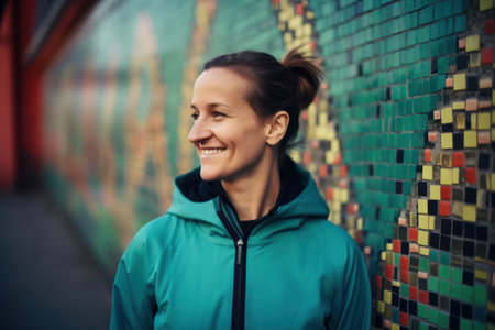Outdoor portrait of a teen girl with teal green hair streak wearing a denim jacket with shamrock patch, standing by a graffiti wall. Youth culture and street style concept.