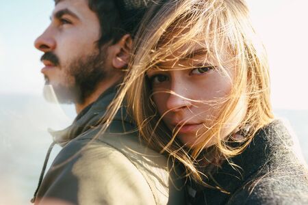 Two young adults enjoy a sunny day, sharing laughter as their wind-swept hair dances in the gentle breeze, embodying the joy of outdoor adventures and friendship.
