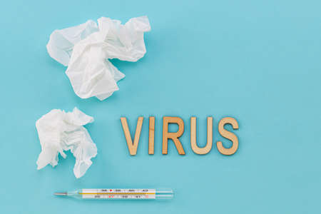 used paper handkerchief thermometer, on a blue background. Virus concept.
