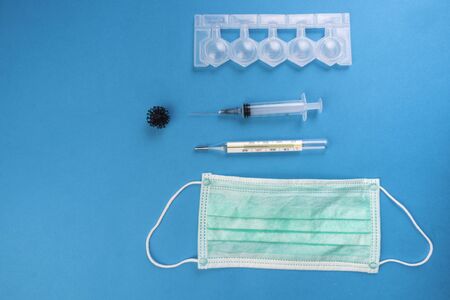 Medical still life on a blue background. Syringe, medical mask, thermometer, nasal spray. Minimalism