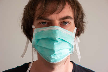 Caucasian young male with uncut hair wearing a green medical mask close up shot front view.