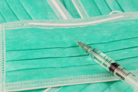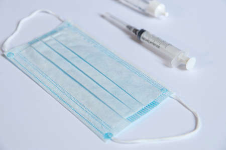 Surgical mask. Protective mask and syringe with vaccine.