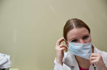 Closeup portrait of a young girl or woman doctor wearing a medical or surgical mask
