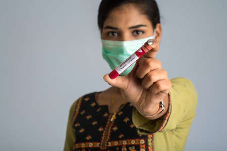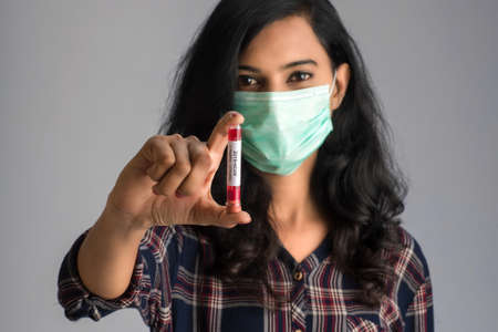 Woman holding a test tube with blood sample for coronavirus or 2019-nCoV analyzing.
