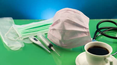 Background from medical protective masks.On the background lies cell COVID-19, ampoules with antibiotics,syringe.The concept of protecting and controlling outbreaks of the SARS epidemic.Copy space.