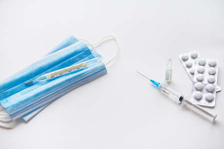 Preparation for vaccination against . Syringe, vaccine, pills, medical mask