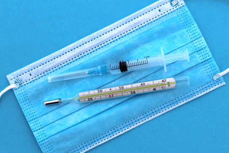 On a medical mask lie a thermometer and a syringe with medicine on a blue background.