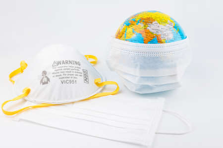 Surgical Face Mask and Globe model. Coronavirus Concept. Medical Face Mask For Stopping The Spread of Flu Virus. Surgical mask with rubber ear straps. Standard surgical mask to cover the mouth and nose. Covid-19.