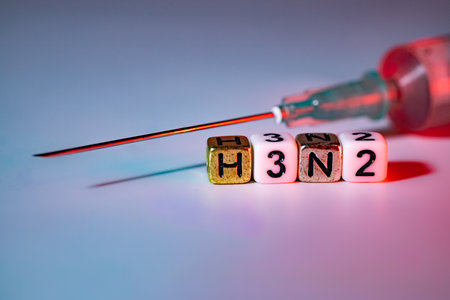 Syringe with needle positioned beside colorful blocks showing H3N2, symbolizing health awareness and medical themes, emphasizing vaccination and disease prevention strategies