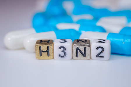 Vibrant capsules and lettered blocks showing H3N2, symbolize health awareness and medical research, arranged creatively with ample copy space for text integration