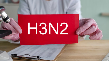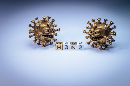 Exaggerated virus model stands behind blocks spelling H3N2, illustrating the concept of infectious diseases and their impact on public health and safety