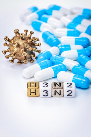 Detailed view of a virus model next to blue and white capsules, with letter blocks showing H3N2, representing health awareness and disease prevention strategies