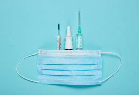 Medical still life on a blue background. Syringe, medical mask, thermometer, nasal spray. Minimalism