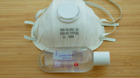 FFP3 mask face coronavirus covid-19 medical health, Hand disinfectant disinfection bottle gel soap, antibacterial moisturiser alcohol, Protection against pollution, virus flu. People prevention against risk infection safety outbreak. Healthcare surgical,