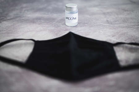 vaccine ampoule with face mask next to it, vaccine race and immunisation against the pandemic conceptual image