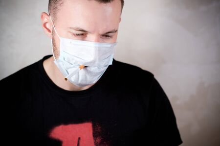 a man in a medical mask sadly holds a cigarette in his mouth through a mask on his face