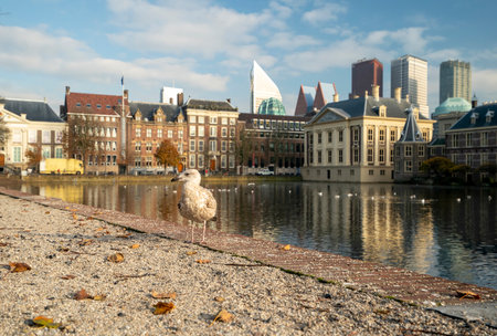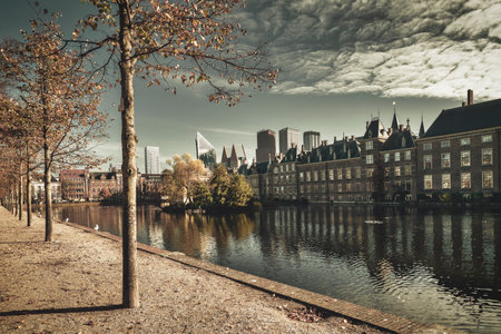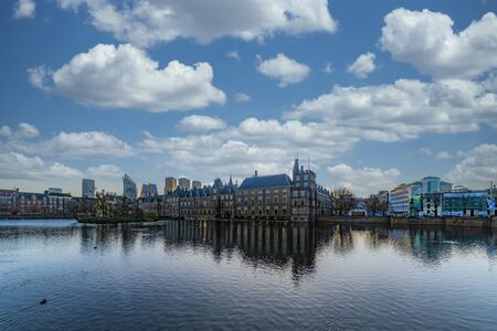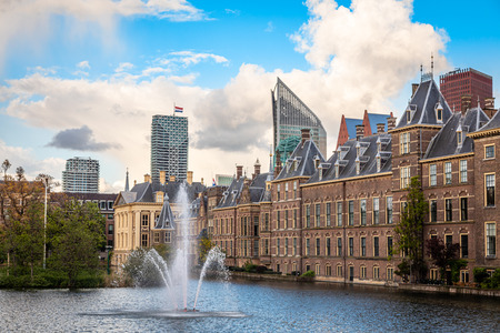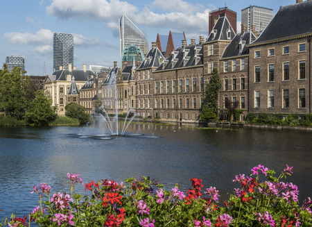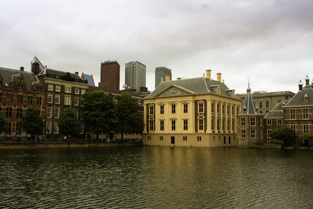 The Hague, The Netherlands - August 6, 2017: Parliament buildings, museum 'Mauritshuis', skyscrapers and the 'Torentje' of prime minister of the Netherlands, in front the pond 'the Hofvijver'.
