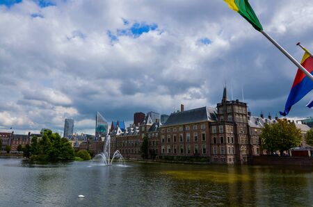 Holland, Den Haag. August 2019. The Hague in English, the Binnenhof is the center of Dutch political life. The buildings overlook the artificial lake with fountains and swans.