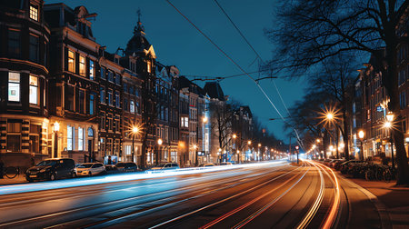 Amsterdam city street at night, Netherlands. Long exposure photography.